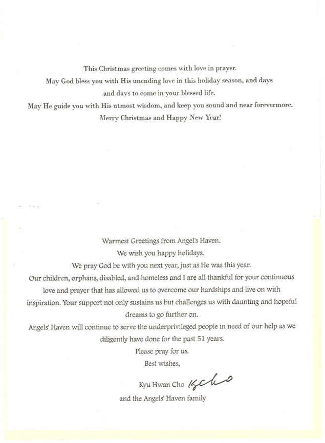 Message from Angels’ Haven in Korea December 21, 2009August 31, 2010 Legal News by admin Holiday Card Front Holiday Card Inside Holiday Card Back Read Letter from Angels’ Haven Previous Post Next Post