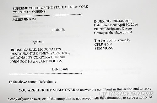 13일(현지시간) 뉴욕·뉴저지의 법무법인 김앤배(Kim&Bae, 대표 김봉준·배문경 변호사)에 따르면 김모(62) 씨는 맥도날드 본사와 뉴욕지사, 퀸즈 매장의 루시 사자드(50.여) 매니저, 성명 불상의 관계자 등을 상대로 1천만달러(약 103억달러)를 요구하는 민사소송을 뉴욕주 퀸즈카운티 법원에 제출했다.