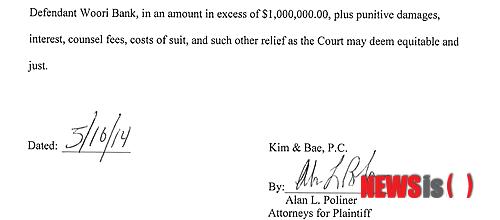 【뉴욕=뉴시스】노창현 특파원 = 우리은행 뉴욕지점에서 발생한 성추행 사건 및 보복해고 논란이 거액의 소송으로 불거지며 파장이 확산되고 있다. 21일 뉴욕주 맨해튼 지방법원에 따르면 우리은행 뉴욕지점의 현지 채용 직원 L씨와 S씨는 한국에서 파견된 상관 A씨가 여직원들과 일부 남자직원들을 성추행한 사실을 알리는 과정에서 부당해고를 당했다며 최소 350만 달러(약 36억원)를 배상하라는 소송을 제기했다. 원고의 법정대리인인 김&배 로펌(대표 김봉준 배문경 변호사)은·“350만 달러의 배상청구는 최소 금액이며 배심원단에 ‘징벌적 손실배상(Punitive Damage)’를 별도 청구했다”면서 “배심원단이 사안의 심각성을 인정할 경우 요구액을 훨씬 뛰어넘는 천문학적인 배상액을 판결할 수도 있다”고 밝혔다. 사진은 지난 16일 제기된 소장의 일부.