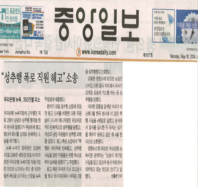 [NY Koreadaily] ‘성추행 폭로 해고 직원’ 소송