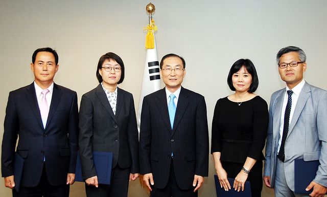 주뉴욕총영사관은 3일 동포 및 민원업무 지원을 위한 법률자문위원을 위촉했다. 왼쪽부터 최윤승 변호사 현보영 변호사 손세주 총영사 배문경 변호사 최영수 변호사.