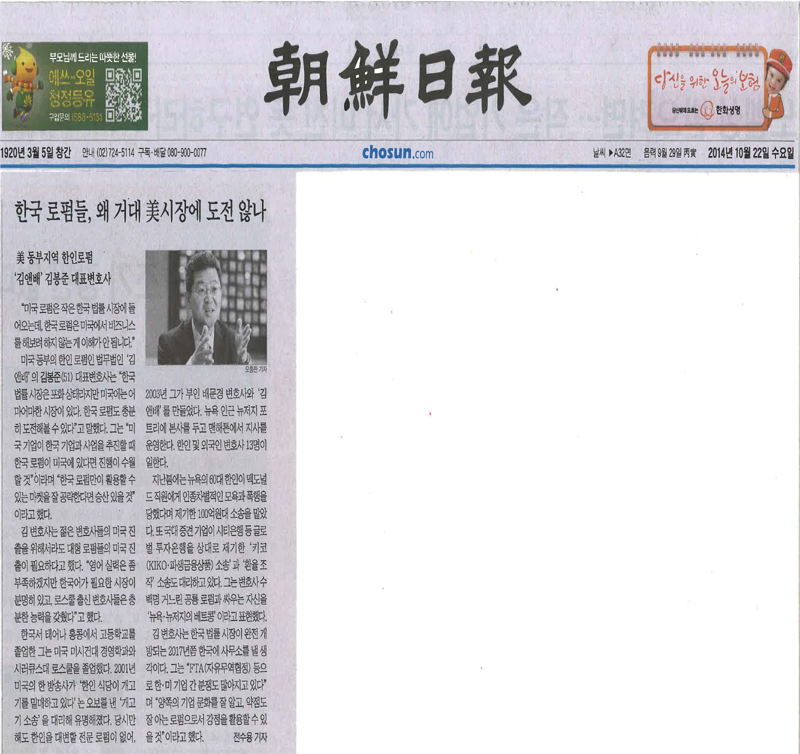 [Chosun.com] 한국 로펌들, 왜 거대 미 시장에 도전 않나 October 31, 2014October 31, 2014 Kim & Bae News by admin Previous Post Next Post